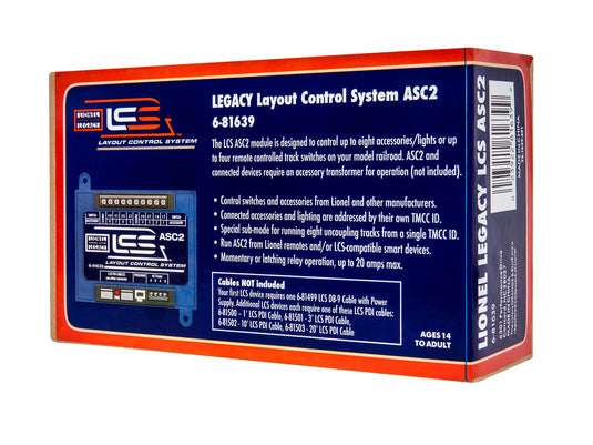 CONTROLER Add more functionality with Optional Add-on Component of the Layout Control System. The ASC2 can be configured toswitch mode" or two types ofaccessory mode" operation. Features When configured in switch mode, an ASC 2 operates up to four remotely operated switches from Lionel and other manufacturers. The ASC2 has eight Normally Open relays, with four banks of two complementary outputs. One pair of relays will activate the "THRU" position with one set of contacts, and the other set of contacts will activate the "OUT" position. Each relay is rated at 20 amps. The starting TMCC "SW" address (0-96) is user configurable and the next three switches are assigned the three subsequent IDs. When configured in accessory mode, up to eight lights, uncoupling tracks or basic on/off accessories can be controlled. Accessory mode is configured as 8 normally open relays, split into two banks of four. Each of these two banks has a common terminal feed. Two addressing schemes are supported in accessory mode. In "single address," the user sets a single TMCC "ACC" ID (0-99) for all eight relays. In operation, the user selects that ID, then hits numeric keypad 1-8. This will pulse the relay to that numbered-relay for one second, then shut off. This is ideal for uncoupling track activation. In "eight address" mode, the user sets a starting TMCC ACC ID for the first relay and the remaining seven are assigned subsequent TMCC IDs (up to ID 99 for the last relay). To operate, a given relay is addressed. Then, pressing the AUX1 key activates that relay as long as the key is held. AUX2 toggles the relay on or off, useful for operating lighting. The ASC2 can be operated from Lionel CAB remotes and/or the LCS App+LCS WiFi. In all operating modes, the ASC2 is connected to the LCS system using an LCS PDI cable. This carries commands as well as power for the ASC2's control electronics. An additional AC power source is required for relay operation